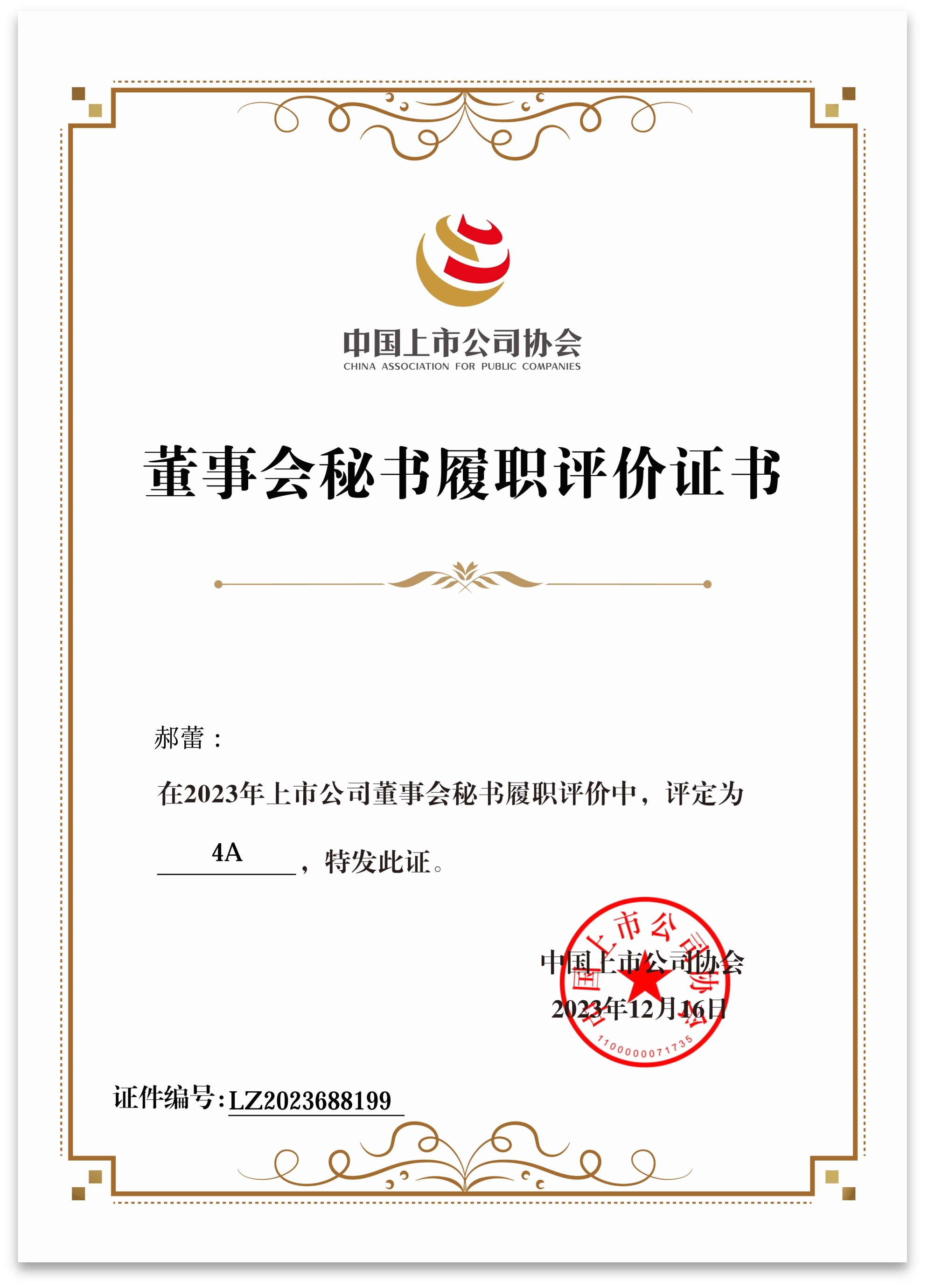 近日,中国上市公司协会发布了“2023上市公司董办最佳实践”和“2023上市公司董事会秘书履职评价”的评选结果,公司继去年荣获“上市公司董办优秀实践案例”和“上市公司董秘履职评价”4A评级后,今年再次获得这两项殊荣。